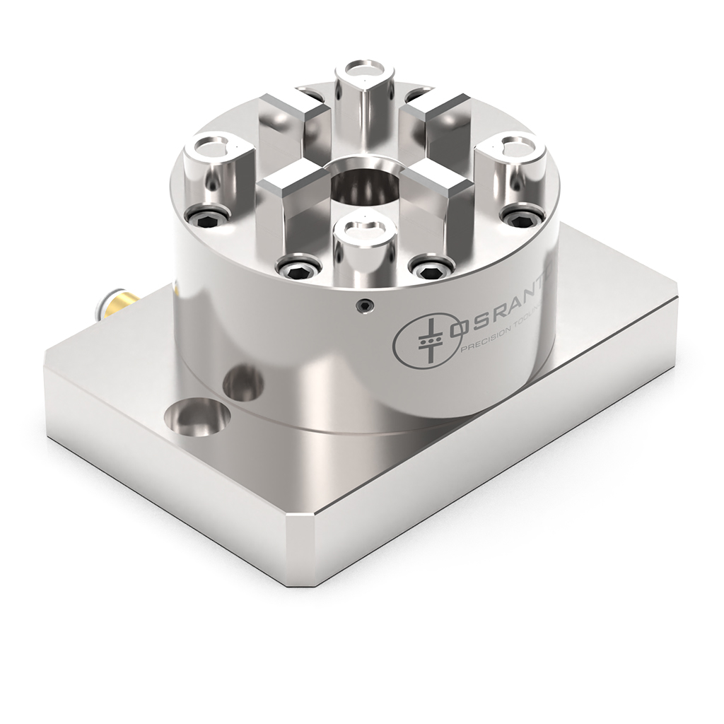 与气动夹头3R-600.10-30兼容 由压缩空气驱动,侧面有2条气管连接 可通过气枪或气控单元操作,用于安装电极夹头,固定分度位置4x90°,可自动化气喷清洁,防金属屑堵塞,重复定位精度±0.002mm。